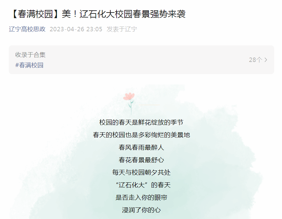 编者按:4月26日,辽宁高校思政微信公众号发布了微文《美!辽石化大校园春景强势来袭》,对我校的美丽校园春景进行了宣传报道。现将相关报道转载如下:
