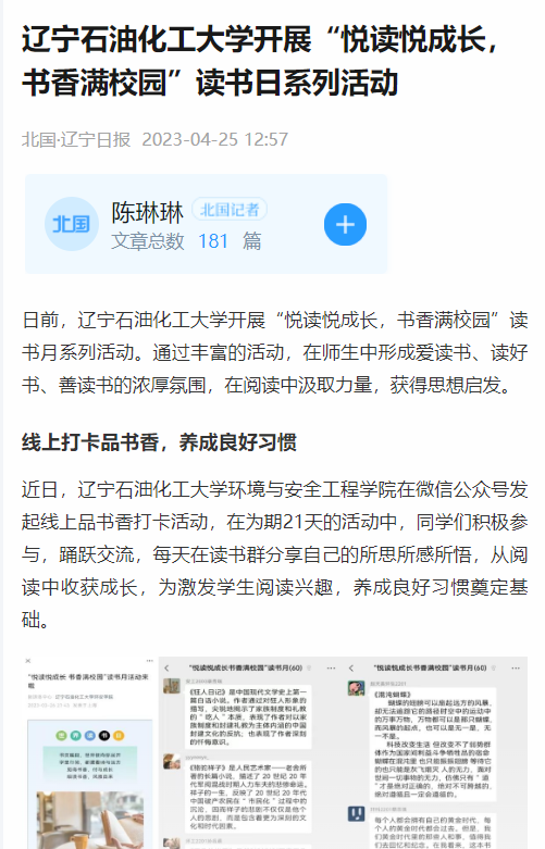 编者按:近日,北国·辽宁日报对我校环境与安全工程学院开展“悦读悦成长,书香满校园”读书日系列活动进行了宣传报道。现将相关报道转载如下: