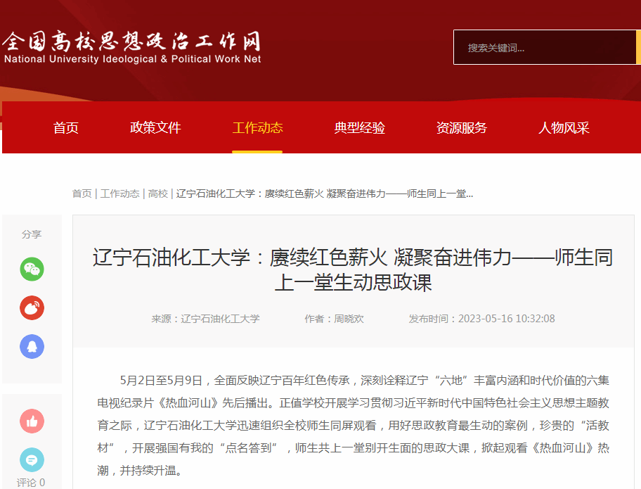 编者按:近日,全国高校思想政治工作网、辽宁日报·北国号等媒体平台对我校组织师生同屏观看,用好思政教育最生动的案例,珍贵的“活教材”,开展强国有我的“点名答到”,师生共上一堂别开生面的思政大课,掀起观看《热血河山》热潮,并持续升温进行了宣传报道。现将相关报道转载如下: