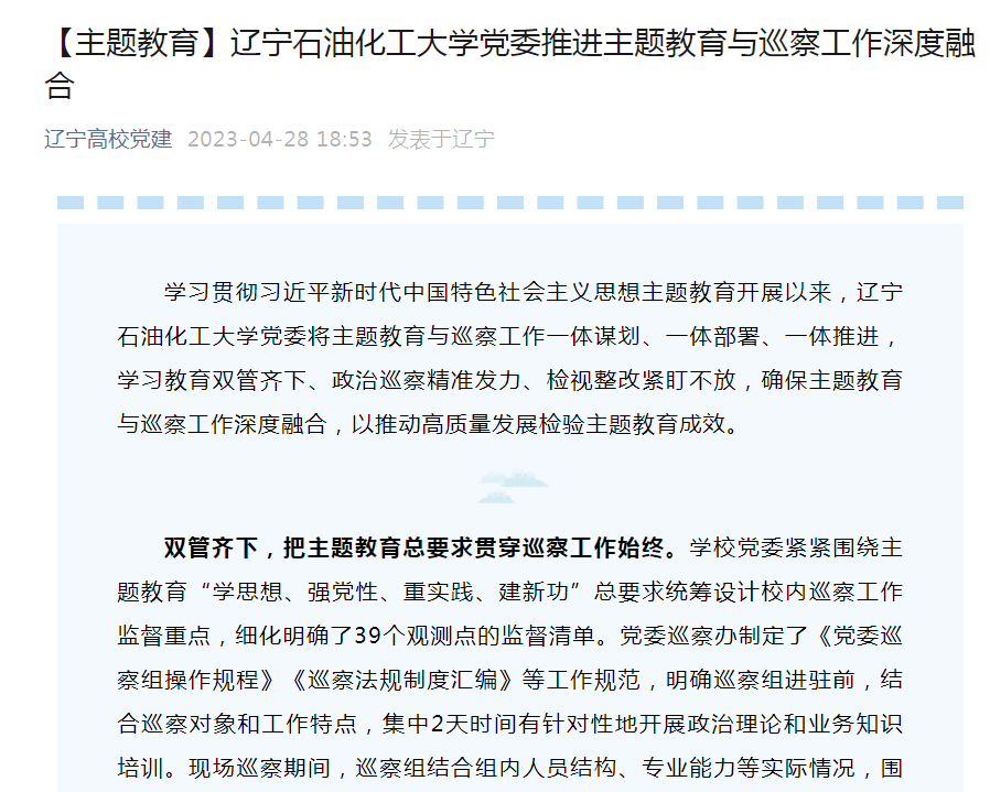 编者按:近日,辽宁高校党建微信公众号、网易新闻等媒体平台对我校党委将主题教育与巡察工作一体谋划、一体部署、一体推进,学习教育双管齐下、政治巡察精准发力、检视整改紧盯不放,确保主题教育与巡察工作深度融合,以推动高质量发展检验主题教育成效进行了宣传报道。现将相关报道转载如下: