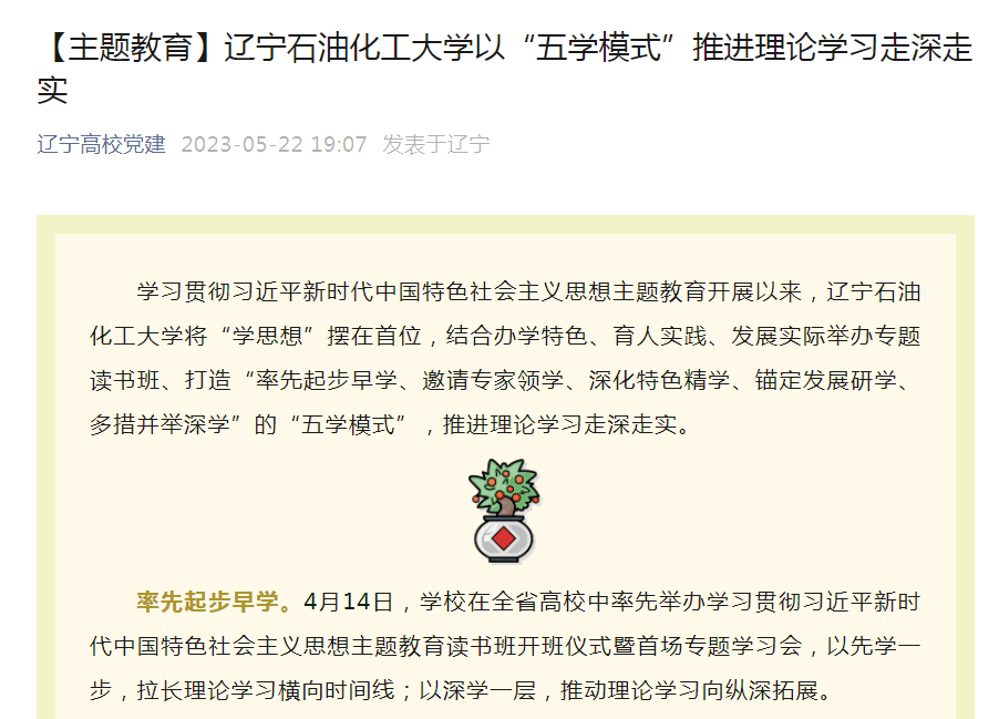 编者按:近日,全国高校思想政治工作网、辽宁高校党建微信公众号、辽宁高校思政微信公众号、辽宁日报·北国号等媒体平台对我校以“五学模式”推进理论学习走深走实进行了宣传报道。现将相关报道转载如下: