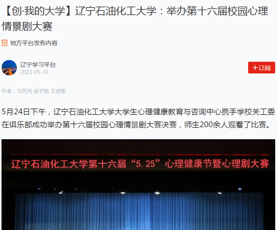编者按:近日,中国大学生在线、学习强国辽宁学习平台、辽宁日报·北国号、人民日报客户端·人民号对我校举办十六届“5.25”心理健康节暨心理剧大赛进行了宣传报道。现将相关报道转载如下:
