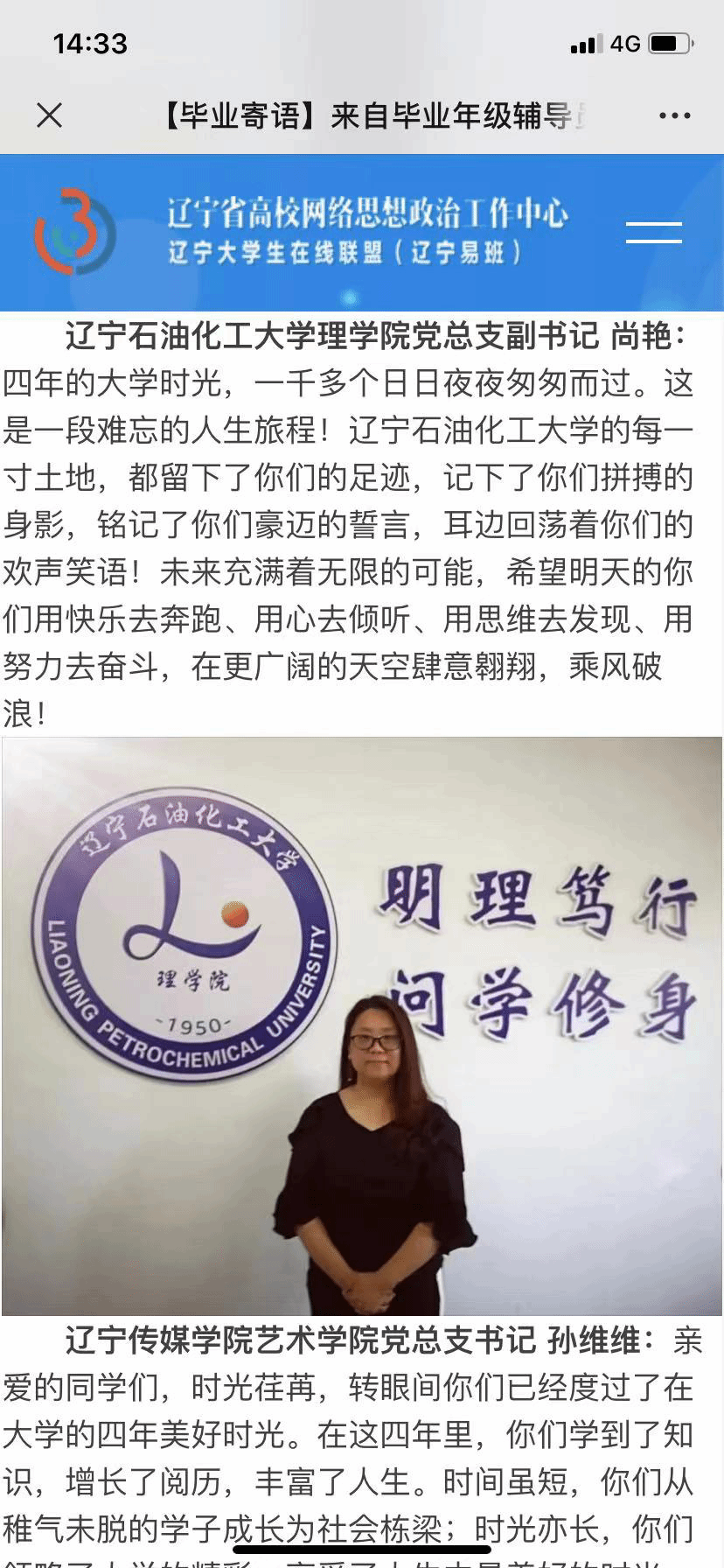 编者按:6月13日,为组织形式多样的“就业育人”主题系列活动,聆听和感受辽宁高校辅导员直抵心灵的温情寄语以及用爱与担当点亮青春的引路微光,辽宁大学生在线联盟(辽宁易班)推出【毕业寄语】来自毕业年级辅导员的款语温言(第一期),其中选取了我校理学院党总支副书记尚艳的毕业寄语。现将相关报道转载如下: