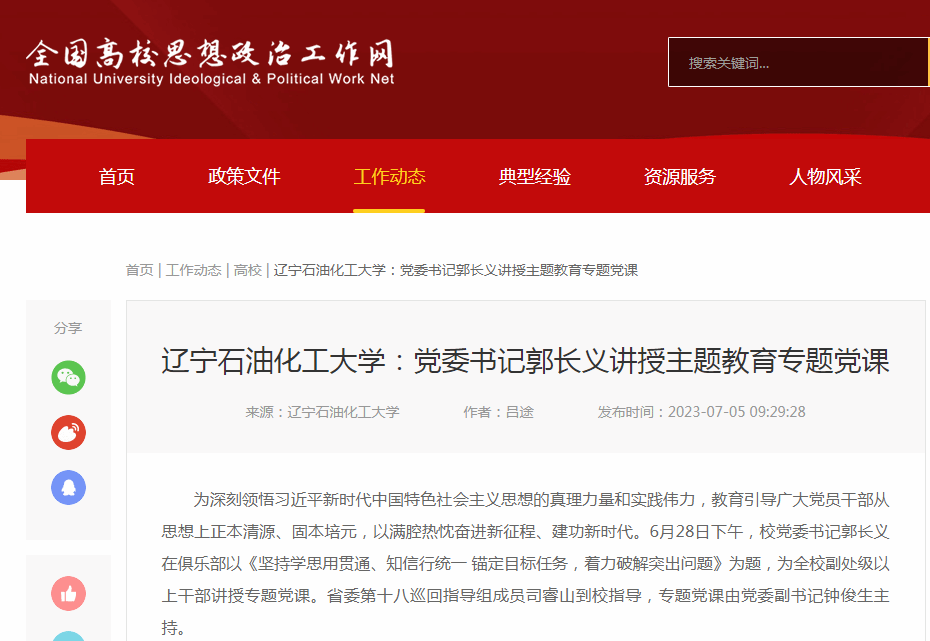 编者按:近日,全国高校思想政治工作网、辽宁日报·北国号对我校党委书记郭长义在俱乐部以《坚持学思用贯通、知信行统一 锚定目标任务,着力破解突出问题》为题,为全校副处级以上干部讲授专题党课进行了宣传报道。现将相关报道转载如下: