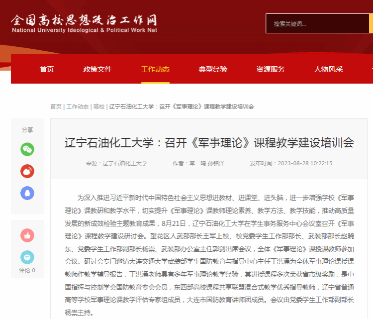 编者按:8月28日,全国高校思想政治工作网、辽宁日报·北国号、人民日报客户端·人民号等媒体平台对我校为进一步增强学校《军事理论》课教研和教学水平,切实提升《军事理论》课教师理论素养、教学技能,推动高质量发展的新成效检验主题教育成果,于8月21日召开《军事理论》课程教学建设研讨会进行了宣传报道。现将相关报道转载如下: