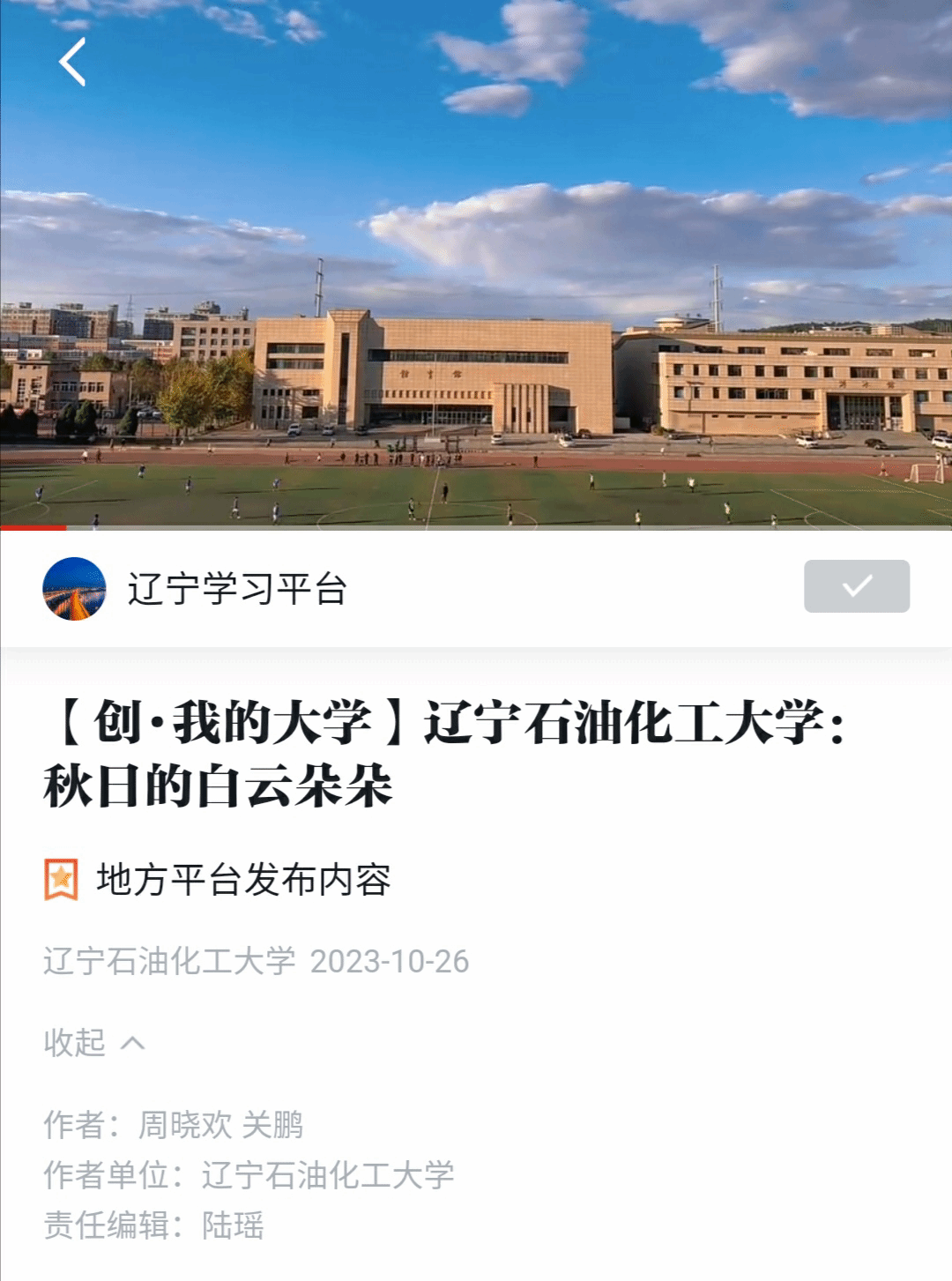 编者按:近日,学习强国辽宁学习平台、辽宁日报·辽望号、人民日报客户端·人民号等媒体平台对我校秋日的白云朵朵的校园美景进行了宣传报道。现将相关报道转载如下:
