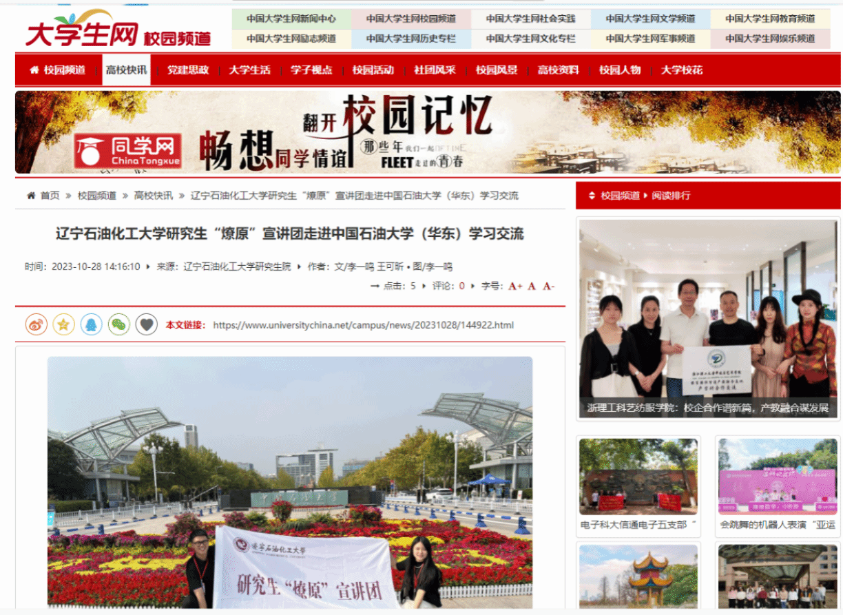 编者按:近日,中国大学生网对我校研究生“燎原”宣讲团走进中国石油大学(华东)学习交流活动进行了宣传报道。现将相关报道转载如下: