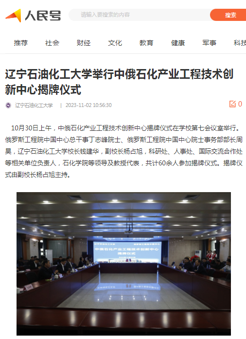 编者按:近日,人民日报客户端·人民号、辽宁日报·辽望号、中国大学生网等媒体平台对我校举行中俄石化产业工程技术创新中心揭牌仪式进行了宣传报道,现将相关报道转载如下: