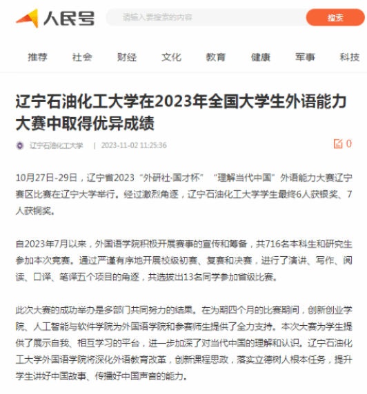 编者按:近日,10月27日-29日,辽宁省2023“外研社·国才杯”“理解当代中国”外语能力大赛辽宁赛区比赛在辽宁大学举行。经过激烈角逐,我校学生最终6人获银奖、7人获铜奖。人民日报客户端·人民号、辽宁日报·辽望号、中国大学生网等媒体平台对此进行了宣传报道,现将相关报道转载如下: