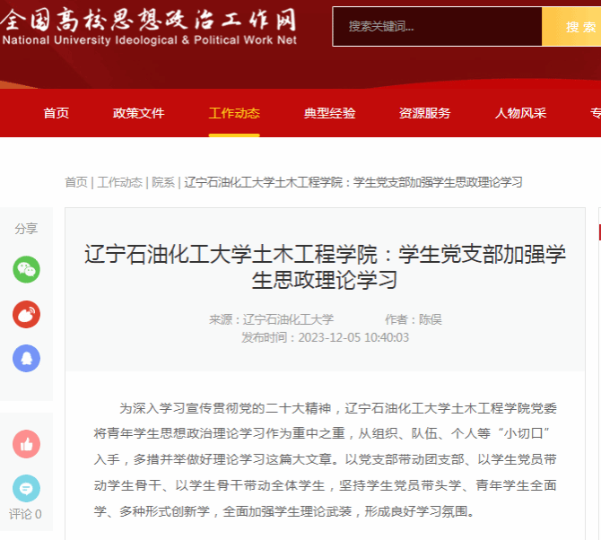 编者按:近日,全国高校思想政治工作网、中国大学生网、辽宁日报·辽望号、人民日报客户端·人民号对我校土木工程学院党委将青年学生思想政治理论学习作为重中之重,从组织、队伍、个人等“小切口”入手,多措并举做好理论学习这篇大文章。以党支部带动团支部、以学生党员带动学生骨干、以学生骨干带动全体学生,坚持学生党员带头学、青年学生全面学、多种形式创新学,全面加强学生理论武装,形成良好学习氛围进行了宣传报道。现将相关报道转载如下: