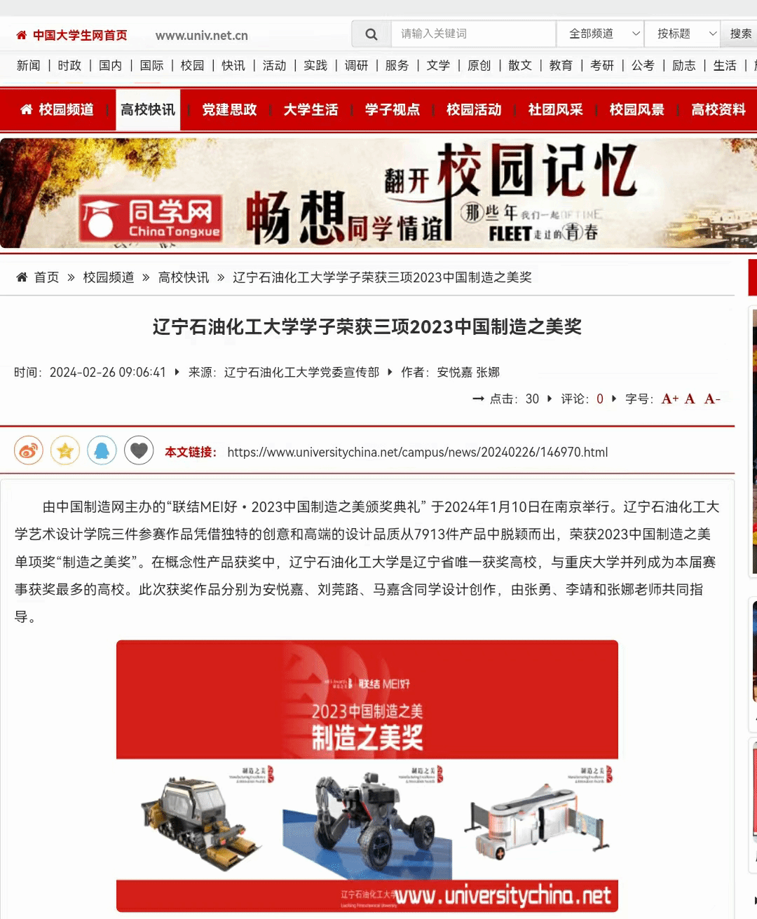 编者按:近日,中国大学生网对我校学子荣获三项2023中国制造之美奖进行了宣传报道。现将相关报道转载如下: