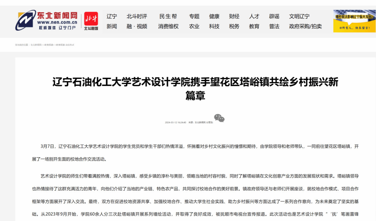 编者按:近日,东北新闻网、人民日报客户端·人民号、辽宁日报·辽望号对我校艺术设计学院师生赴望花区塔峪镇,开展校地合作交流活动进行了宣传报道。现将相关报道转载如下: