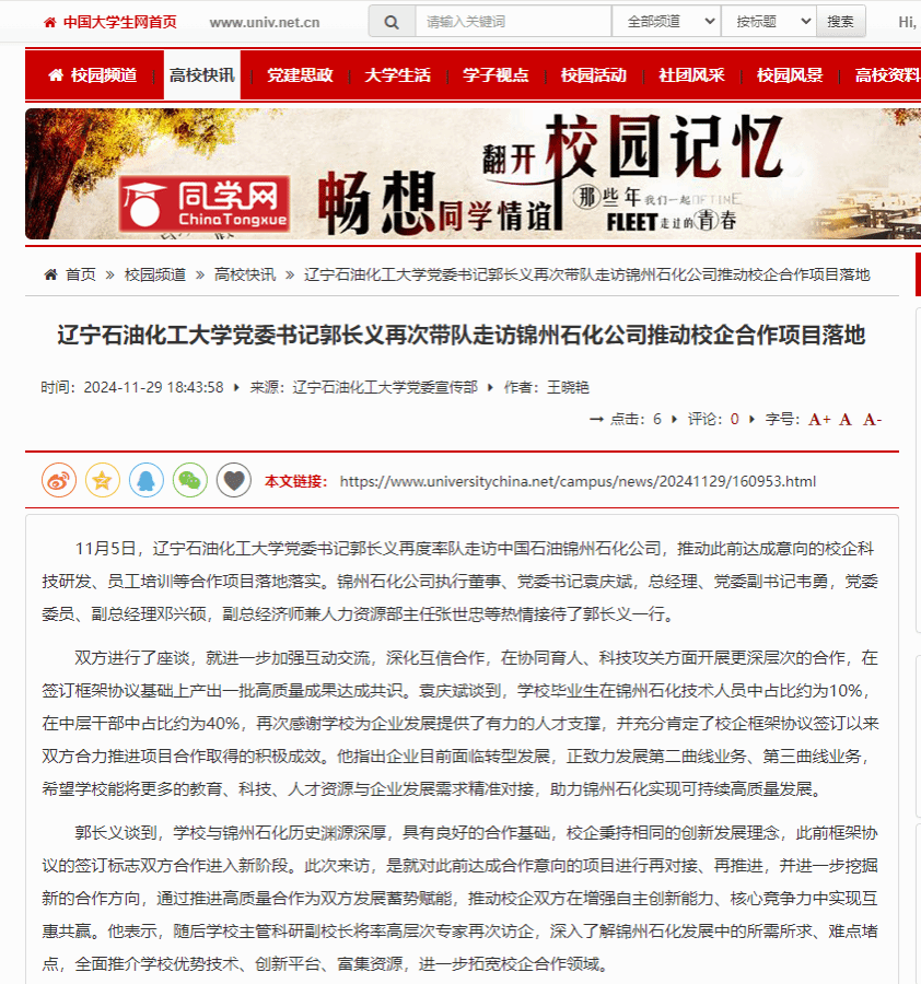 编者按:近日,学校党委书记郭长义再度率队走访中国石油锦州石化公司,推动此前达成意向的校企科技研发、员工培训等合作项目落地落实。中国大学生网、人民日报客户端•人民号、辽宁日报•辽望号、搜狐号对此进行了宣传报道。现将相关报道转载如下: