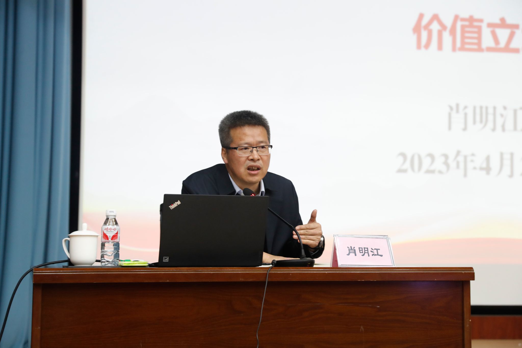 肖明江以哲学社会科学的基本视阈——规律与价值为出发点,围绕“习近平新时代中国特色社会主义思想的价值立场”主题,阐释了习近平新时代中国特色社会主义思想的人民立场。重点对把握习近平新时代中国特色社会主义思想的价值内核,坚持以人民为中心的根本立场和价值取向,以人民利益为根本标准衡量中国式现代化作了深刻阐述。并结合自身工作经历和实践经验指出,高校应该深刻领会习近平新时代中国特色社会主义思想的价值立场,坚持以师生为本,贯彻落实好习近平总书记关于教育的重要论述,紧密联系师生实际,切实做好大学生思想政治工作,适应高等教育变化新形势,守好舆论主阵地,兜牢意识形态底线。